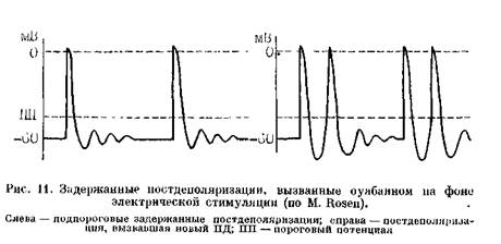 ной мембраны [Cranefield P., 1977]. Они изучены лучше, чем ранние постдеполяризации. Последовательность событий здесь такая же, как и при ранних постдеполяризациях. Подпо-роговое, демпфированное колебание мембранного потенциала себя не проявляет. Если же его амплитуда возрастает, достигая порога возбуждения, то возникает наведенный импульс—новый, преждевременный ПД (рис. 11). Этот ПД может, в свою очередь, быть источником другой пороговой осцилляции — ПД и т. п. В конечном счете формируется цепь триггер-ных возбуждений. В эксперименте отмечено, что увеличение амплитуды задержанных ностдеполяризаций происходит тогда, когда в клетках повышается концентрация ионов Caf+. Медленный входящий Са++-ток не втянут непосредственно в этот процесс. Задержанные постдеполяризации генерируются «транзиторным входящим током», (iti), переносимым ионами Na+ и частично К+, но регулируемым внутриклеточной концентрацией ионов Са++, на которую влияет вхождение ионов Са++ в клетку [Marban E., Tsi-en R., 1982; Marban E., Smith Т., 1986; Gintant G., 1988]. Триггерную активность, вызываемую задержанными постдеполяризациями, изучали в волокнах Пуркинье, на которые воздействовали токсическими дозами сердечных гликозидов [Verrier G., 1977; Moak J., Rosen M., 1984], в предсердных клетках коро- нарного синуса, обработанных кате-холаминами [Wit A., Cranefield P., 1977; Wit A. et al., 1981], при экспериментальном инфаркте миокарда [Le Marek H. et al., 1985; Kimura S. et al., 1987], в предсердных и желудочковых волокнах человека in vitro [Dangman К. et al., 1982]. В 1988 г. S. Priori и соавт. впервые продемонстрировали in vivo (у кошек), что задержанные постдеполяризации можно вызвать путем раздражения левого звездчатого ганглия. В отличие от ранних постдеполяризаций, возникновению (усилению) которых способствует брадикардия, задержанные постдеполяризации стимулируются учащением сердечного ритма. Это, по-видимому, происходит при синусовой тахикардии у больных с гипертрофией левого желудочка, кардиомиопатиями, ишемией миокарда. Вероятно, такой же характер носит «триггерный взрыв» — возникновение осцилляторной активности у некоторых больных вслед за периодом сверхчастой или программированной электрической стимуляции сердца [Wit A., Rosen M., 1983]. Весьма вероятно, что триггерную природу имеют ЖТ, вызываемые физической нагрузкой у больных без ИБС и других органических заболеваний сердца (см. стр. 309). Триггерные ритмы, связанные с интоксикацией дигиталисом (волокна Пуркинье) и зависящие от воздействия адреналина на предсердные клетки коронарного синуса, имеют как сходство, так и различия [Johnson N. el a)., 1986]. В лервом случае, по-видимому, сразу же устанавливается постоянная частота эктопического ритма; во-втором — отмечается постепенное укорочение длины циклов, т. е. «разогрев» ритма с последующей его стабилизацией. Дигиталисно-токсиче-ские триггерные ритмы могут прерываться остро. Триггерный ритм, исходящий из коронарного синуса, замедляется постепенно («охлаждение») до момента исчезновения. Правда, эти факты еще нуждаются в дальнейшем клиническом подтверждении. Имеет смысл рассмотреть некоторые вопросы дифференциальной диагностики триггер-ных, анормальных автоматических и реципрокных (re-entry) ритмов в экспериментальной работе и в процессе клинических электрофизиологических исследований. Пока эта проблема не может считаться решенной, но мы усматриваем определенную пользу в систематиз