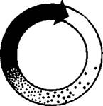 Рис. 15. Схема re-entry no малому кругу, не связанному с анатомическим препятствием — leading circle no M. Allessie (объяснения в тексте). тельное движение в разных направлениях. По мере приближения к центру амплитуда и скорость подъема фазы О ПД понижались, и возбуждение затухало. Клетки в центре циркулировавшей волны давали только локальный электрический ответ, поскольку они поддерживались в рефракторном состоянии под воздействием поступавших с разных сторон импульсов. Место схождения этих импульсов служило функциональной основой для циркуляции волны возбуждения. Оно как бы заменяло анатомическое препятствие и защищало возбуждение от шунтирования (рис. 15). Такое явление можно сравнить с водоворотом и воронкой в его центре. М. Allessie и соавт. (1977, 1980) назвали эту движущуюся, вращающуюся систему термином leading circle (leading circuit), т.е. «ведущий кружок» (цикл), или ведущая петля microre-entry, которая и определяет частоту возбуждения миокарда предсердий. В предсердиях может быть несколько таких кругов, и самый меньший из них оказывается ведущим, так как в круге с наименьшим диаметром будет и самое короткое время обращения волны возбуждения. При столь малых размерах круга стимулирующий эффект движущейся волны оказывается достаточным, чтобы возбудить лежащий впереди участок миокарда, еще не вышедший из состояния функциональной рефрактерности. Другими словами, в кольце microre-entry нет «окна», т. е. зоны полностью восстановленной возбудимости; «голова» волны непосредственно следует за ее «хвостом». Длина ведущего круга оказывается равной длине волны возбуждения.