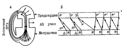 Рис. 101. Схемы кругового движения импульса при АВ реципрокной орто-дромной ПТ у больного с синдромом WPW (АБ). Впервые D. Durer и соавт. (1967) сумели вызвать у больного, имевшего на ЭКГ признаки синдрома WPW, приступ АВ реципрокной ПТ. Теперь общепризнано, что ПТ при синдроме WPW является классическим примером macrore-entry. Круг (петля) reentry здесь значительно длиннее, чем при АВ узловой реципрокной тахикардии. Он включает следующие структуры: АВ узел, общий ствол пучка Гиса, ножку пучка Гиса, сеть Пуркинье, миокард желудочка до места присоединения к его стенке ДП, собственно ДП, миокард предсердия от места присоединения к нему ДП до АВ узла (рис. 101, а. б). Предсердие и желудочек образуют в этом круге верхний и нижний конечные пути. У больных с разным расположением ДП имеются различия в пред, сер дном звене круга re-entry. Если при правосторонних и перегородочных ДП в круг re-entry входит нижнеперегородочная часть правого предсердия, то при левосторонних ДП эта часть предсердия, по-видимому, не всегда является обязательным компонентом круга re-entry [Morady F. et al., 1983]. Следовательно, допускается, что у некоторых больных с синдромом WPW имеются входы в АВ узел со стороны правого и левого предсердий. Движение импульса по петле reentry может осуществляться в двух направлениях Особенно часто встречается вариант АВ реципрокной ПТ, при которой волна возбуждения распространяется антероградно через АВ узел в систему Гиса — Пуркинье, ретроградно — через ДП к предсердию. Эту тахикардию называют орто-дромной АВ реципрокной (круговой) ПТ [Fontaine G. et al., 1975], или АВ реципрокной (круговой) ПТ типа I-A [Wellens H. et al., 1980]. Значительно реже можно наблюдать вариант АВ реципрокной тахикардии, при котором волна возбуждения совершает круговое движение по той же петле: антероградно через ДП, ретроградно через систему Гиса — Пуркинье и АВ узел к предсердию. Эту тахикардию называют антидромной АВ реципрок- ной (круговой) ПТ [Fontaine G. et al., 1975], или АВ реципрокной (круговой) ПТ типа I-B [Wellens H. et al., 1980].