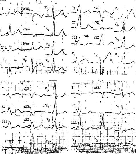 Рис 134. Синдром WPW A — тип 10; Б — тип 10 с большой волной Д; В — тип 10 вместе с внутрижелудочковой блокадой; Г — тип 9 ляция QRS в V] положительная, она нарастает к отведениям V2 и V3; во всех остальных грудных отведениях комплексы QRS тоже направлены кверху. Волна А всегда положительная в отведении Vi. Правый боковой ДП. Встречается в 18% от числа всех ДП. Ось волны А во фронтальной плоскости направлена к области от —30° до —60°; эта волна отрицательная в отведениях III, II, aVF, положительная в отведениях I и aVL. Ось главной осцилляции QRS во фронтальной плоскости направлена к —60°. Аномалия Эбштейна обычно сочетается с пред-возбуждением через правый боковой ДП.