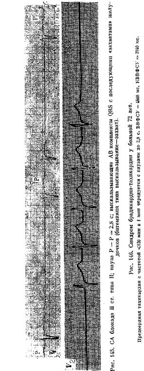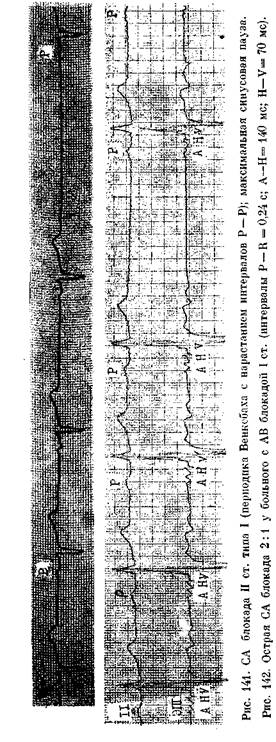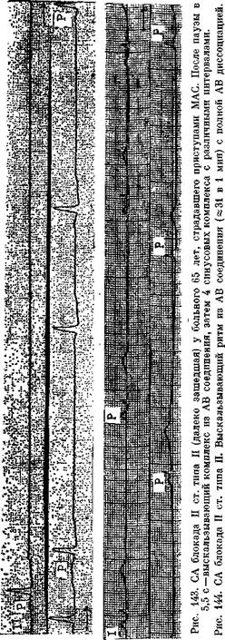 соотношения между числом синусовых импульсов и зубцов Р (3: 2, 4: 3, 5: 4 и т. д.). Как уже упоминалось, в период блокирования (выпадения) синусового импульса отсутствуют зубец Р и соответствующий ему комплекс QRS, волна а на флебограмме яремной вены, IV тон на ФКГ и волна предсердного прикрытия на эхо-кардиограмме. Пауза определяется при пальпации пульса на лучевой артерии и выслушивании сердца (нет I и II тона). Если СА периодика Венкебаха сочетается с уреже-нием синусового ритма, то больной может ощутить головокружение, поскольку значительно удлиняется интервал Р—Р (пауза). СА блокада II степени типа II (блокада Мобитца) распознается по внезапному, острому блокированию одного-двух синусовых импульсов без подготовительной периодики Венкебаха (рис. 142). Соотношения между общим числом синусовых импульсов и числом импульсов, проведенных к предсердиям (зубцов Р), бывают 2: 1, 3: 1, 3: 2, 4: 3, 4: 2, 5: 4 и т. д. В подобных случаях удлиненный интервал Р—Р (пауза) равен удвоенному или утроенному основному интервалу Р—Р. Систематическая СА блокада 2: 1 иногда ошибочно воспринимается как синусовая бради-кардия, постоянная СА блокада 3: 2 имитирует бигеминию, такая же блокада 4: 3 напоминает тригеминию. По аналогии с АВ блокадой затянувшуюся СА блокаду 4:1, 5:1 и т. д. следует называть далеко зашедшей СА блокадой II степени типа II. Длинный интервал между зубцами Р синусового происхождения будет равен произведению из основного интервала Р—Р на соответствующий множитель. В части случаев пауза (изоэлектрическая линия) прерывается выскальзывающими комплексами (ритмами) из пред-сердных центров автоматизма или, что бывает чаще, из области АВ соединения (рис. 143). Иногда запаздывающие синусовые импульсы встречаются (совпадают)