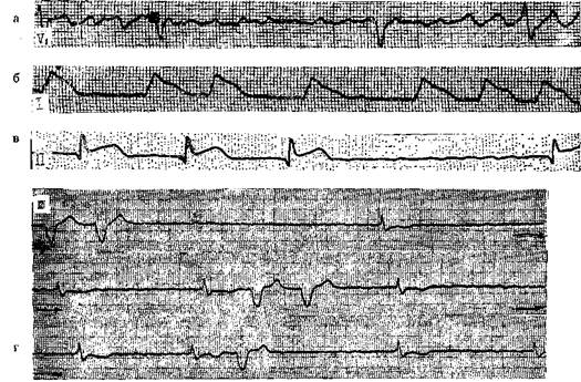Рис. 169. а — ФП; нерегулярные волночки f различной формы и величины, интервалы R — R от 0,68 до 1,30 с; б — ФП у больного в остром периоде переднебокового инфаркта миокарда; блокада левой ножки пучка Гиса; в — ФП у больного в остром периоде нижнего инфаркта миокарда; г — фибрилляция предсердий; субтотальная АВ узловая блокада; желудочковая парасистолия с блокадой выхода II степени типа П. между сторонниками двух точек зрения может закончиться принятием синтетической теории о существовании в предсердиях при фибрилляции частой фокусной импульсации и кругового движения волн возбуждения [Розенштраух Л. В., Зайцев А. В., 1991; Hashida E. et al., 1980]. Ниже мы представим дополнительные данные о патогенезе ФП.