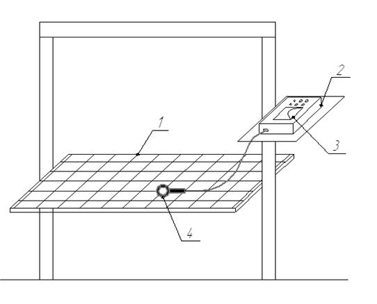 Лабораторна робота виконується на лабораторній установці яка складається з робочої поверхні 1 та переносного фотоелектричного люксметра 2 (рис. 2.1). Робоча поверхня представляє собою поверхню стола, розмічену сіткою, для рівномірного виміру освітленості в кожній умовній точці робочої поверхні. Для вимірювання освітленості використовуються переносні фотоелектричні люксметри. Принцип їх дії заснований на явищі фотоелектричного ефекту. У даній лабораторній роботі використовується люксметр Ю116.