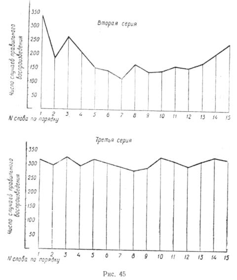 В обоих этих констатированиях есть некоторое кажущееся противоречие: действительно, если, с одной стороны, общий характер кривой частоты и соответствует нашему пониманию процесса, изучаемого примененной нами методикой с картинками, то, с другой стороны, мы, однако, не можем установить никакой положительной корреляции между памятью на слова без употребления внешних вспомогательных стимулов и между запоминанием внешне опосредствованным. Не указывает ли это на какую-то ошибку в наших общих представлениях об изучаемом процессе, ибо иначе трудно объяснить себе отсутствие этой корреляции, принимая во внимание наше соображение о принципиальном тождестве механизмов внешне опосредствованного запоминания и запоминания осмысленного материала по крайней мере у наших старших испытуемых? Однако при более пристальном рассмотрении этого обстоятельства его объяснение не представляет никакой трудности именно с точки зрения развиваемой нами концепции. Как мы видели это выше, для наших испытуемых младшего возраста сравниваемыми между собой процессами являются, с одной стороны, неопосредствованное запоминание, с другой, запоминание внешне опосредствованное; естественно, что при том принципиальном различии, которое существует в структуре соответствующих операций, положительная интеркорреляция их результатов едва ли возможна; скорее, наоборот, существующая между ними известная противоположность заставляет нас ожидать взаимного несоответствия показателей их эффективности, что в действительности и подтверждается нашим фактическим материалом. Впрочем, к вопросу об отношении между натуральным и опосредствованным запоминаниями в этом возрасте мы еще неоднократно будем возвращаться в дальнейшем изложении и поэтому сейчас ограничимся лишь высказанным нами общим указанием.