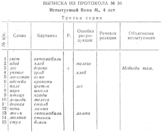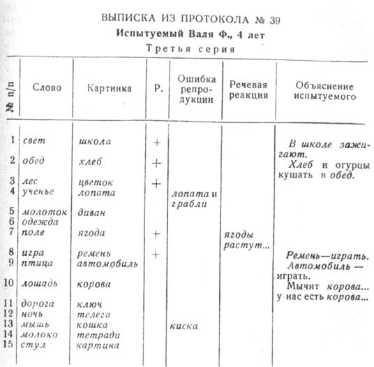 Так, испытуемый № 24, 4 лет, выбирает к слову ученье картинку, изображающую школьные тетради; воспроизведение — «в школу ходят». Испытуемый № 25, 5 лет, выбирает к слову обед картинку школа; воспроизвести слово не может; на вопрос, почему он взял эту картинку, отвечает: «В школе и учатся и обедают». Тот же испытуемый к слову ночь подбирает картинку, изображающую дерево; слово не воспроизводится, однако испытуемый дает уверенное объяснение: «Озорники ночью по дереву лазают».
