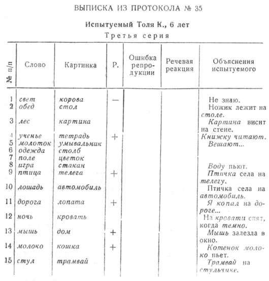 Таким образом, судьба запоминаемого слова на этом этапе развития еще во многом зависит от моментов случайных, не могущих быть наперед учтенными испытуемыми. Приведенные нами соображения, конечно, являются совершенно гипотетичными и, вероятно, весьма упрощенными, однако те основные моменты, которые мы здесь отмечали, встречают себе многочисленные подтверждения. Главное из них — это, несомненно, случаи «комментирующих» объяснений, которые при иной технике опроса должны были бы появляться гораздо чаще, чем в наших опытах, где мы предъявляли испытуемому одновременно и слово и выбранную им картинку и тем самым искусственно толкали его на их связывание. Наличие таких подсказанных в «объяснениях» связей нетрудно установить по самому их характеру; например, тот же испытуемый № 39 дает к картинке ремень пояснение: ремень — играть и тотчас же за этим совершенно персеверативно: «На автомобиле — играть». Или еще отчетливее, у испытуемого № 35: