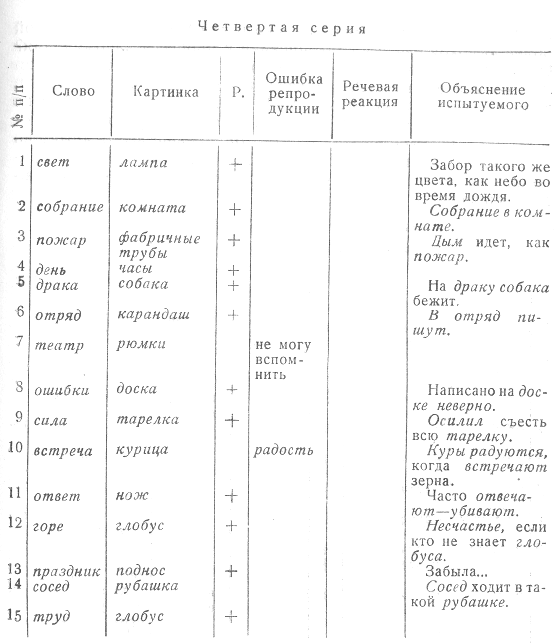 Остановимся на самом простом случае связи: молоко — стакан,— такова особенно часто встречающаяся в наших опытах связь; она может быть признана вполне удачной, однако она, несомненно, сильнее в прямом направлении, чем в направлении обратном. Здесь образ стакан может с равным, а пожалуй и с большим, успехом вызывать: чай, вода и т. д. Значительно лучше с этой точки зрения связь, более типичная для школьников, молоко — корова; эта связь весьма легко обратима. Самый механизм такой связи гораздо отчетливее виден в более сложных случаях. Испытуемый № 569 (см. протокол № 569) выбирает к слову дождь картинку, изображающую забор, причем объясняет свой выбор следующим образом: «Забор такого же серого цвета, как небо во время дождя». Подобную связь испытуемые дошкольного возраста, конечно, образовать не в состоянии, однако, в чем же особенность этой более высокой связи в ее отношении к процессу запоминания? Одной только степенью ее сложности или моментом сближения весьма отдаленных образов, на которых она построена, едва ли можно объяснить ее эффективность,— ее своеобразие заключается, очевидно, в том, что она образована от картинки к слову, а не наоборот. Слово дождь меньше всего может по ассоциации вызвать образ частокола, однако вид серого забора, действительно, вызывает образ серого дня, серого дождливого неба.