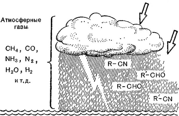 Как же эволюционировала жизнь? Каким образом эти элементы объединялись, чтобы сформировать живое вещество? На сегодняшний день достаточно информации, чтобы сделать обоснованные предположения. Теория происхождения жизни детально была разработана в 1924 году в книге академика биохимика А. И. Опарина «Происхождение жизни». Согласно этой теории возникновение жизни — результат длительной эволюции на Земле — сначала химической, из первичной атмогидросферы, затем биохимической. Эта концепция получила наибольшее признание в научной среде. Все известное живое на Земле включает широкий спектр форм от высокоорганизованных животных, простейших одноклеточных организмов, до одиночных белковых молекул, представленных различными вирусами. Последние существуют то в инертной кристаллической форме, то в подвижном состоянии. Сама белковая молекула состоит из более простых частей ─ соединений углерода, водорода, азота, кислорода, связанных между собой определенным образом и образующих так называемые аминокислоты. Американские ученые С. Л. Миллер и Г. К. Юри в 1953 году, на основе теории Опарина, первыми поставили опыты с искусственной атмосферой. Ученым удалось образовать аминокислоты из соединений, которые предположительно входили в состав первичной атмогидросферы Земли — газообразной смеси водорода (H2), метана (СН4), аммиака (NH4) и водяного пара (H2O). Данный состав газов полностью соответствует газовому составу вулканических газов. Эту смесь подвергали сильным электрическим разрядам, а затем конденсировали. В полученной жидкости были обнаружены аминокислоты, другие углеводы и многие компоненты живой материи. Одним из главных факторов было отсутствие свободного кислорода, при наличии которого идут интенсивные окислительно-восстановительные процессы и наличие достаточного количества энергии. Такие опыты были повторены биохимиками Японии и СССР. Опыты убедительно доказали, что аминокислоты легко могли синтезироваться в первичной атмосфере Земли. Разные вариации исходных газов и источников энергии убедили, что среди продуктов синтеза обнаруживаются многие природные аминокислоты, в том числе лейцин, изолейцин, серин, треонин, аспаргин, лизин, фенилаланин и тирозин. Среди синтезированных аминокислот встречались и такие, которые сейчас не входят в состав живых форм. Источником энергии для синтеза мономеров, вероятнее всего, были электрические разряды. В данное время на Земле каждую секунду происходят более тысячи рязрядов молний. В первичной гидроатмосфере, клубящимся паром окутывавшей еще не вполне остывшую Землю, этих электрических разрядов должно было быть во много раз больше, чем сейчас: от одного до ста миллионов в секунду. Эта энергия высвобождалась непосредственно над поверхностью первородного океана, и продукты синтеза могли растворяться в воде.