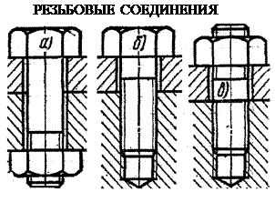 Рис.1 Основные детали соединения имеют наружную либо внутреннюю винтовую нарезку (резьбу) и снабжены огранёнными поверхностями для захвата гаечным ключом. Болт – длинный цилиндр с головкой и наружной резьбой. Проходит сквозь соединяемые детали и затягивается гайкой (рис.1,а) – деталью с резьбовым отверстием. Винт – внешне не отличается от болта, но завинчивается в резьбу одной из соединяемых деталей (рис.1,б). Шпилька – винт без головки с резьбой на обоих концах (рис.1,в). Резьбовые соединения различают по назначению на: è резьбы крепёжные для фиксации деталей (основная – метрическая с треугольным профилем, трубная – треугольная со скруглёнными вершинами и впадинами, круглая, резьба винтов для дерева) должны обладать самоторможением для надёжной фиксации;