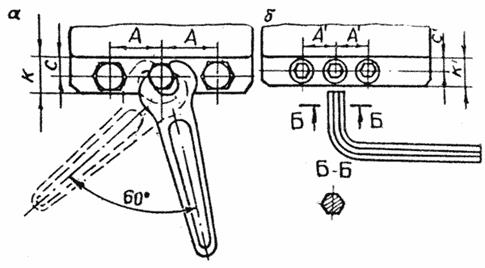 Рис.9 Все винты (и болты) по форме их головок можно разделить на три группы: захватываемые инструментом снаружи (рис. 9а,б,в); захватываемые инструментом о торца (рис. 9г.д.е); с головками, препятствующими провороту винта (рис. 9ж,з). Головки винтов с наружным захватом. Обеспечивают наибольшую силу затяжки, но при этом требуется больше места для захвата ключом. Широкое распространение получила шестигранная головка (Рис. 9а,б), для которой требуется поворот гаечного ключа (рис. 10а) на 1/6 оборота до перехвата за следующие грани (при условии, что ключ не переворачивается). Для уменьшенной шестигранной головки (см. рис. 96) нужно меньше места для размещения. Это позволяет снизить массу конструкции. В условиях частого завинчивания и отвинчивают и при наличии свободного пространства для поворота ключа применяют квадратные головки (см. рис. 9в). которые при тех же габаритах имеют более широкие грани. Головки с торцовым захватом. Можно размещать в углублениях, что улучшает внешний вид, уменьшает габариты и создает удобства обслуживания машины. В зависимости от формы применяемого инструмента такие головки выполняют: о внутренним шестигранником (см. рис. 9г). шлицем под обычную отвертку (см. рис. 9д) или с крестовым шлицем под специальную отвертку (см. рис. 9е). Винты с внутренним шестигранником обслуживаются простым ключом в виде изогнутого под прямым углом прутка шестигранного профиля. На рис. 10 показаны гаечный ключ (рис. 10а) для винта с наружным шестигранником и ключ прутом для винта с внутренним шестигранником (рис. 106). Во втором случае размеры соединения (А - расстояние до соседнего винта, С - до стены, К - ширина фланца) меньшие. Широкое применение винтов с внутренним шестигранником объясняется еще и тем, что прочность граней шестигранного отверстия меньше прочности стержня винта, и его невозможно оборвать при затяжке, а процесс затяжки легко поддается автоматизации. Головки винтов для завинчивания отверткой (см. рис. 9д,е) могут быть цилиндрическими, полукруглыми, потайными или полупотайными. Головки с крестовым шлицем (см. рис. 9е) более совершенны, так как такой шлиц лучше сопротивляется обмятию.