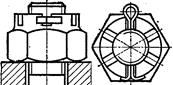 Рис.10 Головки, препятствующие провороту. Подразделяют на головки специальной формы, закладываемые в гнезда, или головки с двумя параллельными рабочими гранями, закладываемые в пазы (см. рис. 9ж), и круглые головки с усиком, вызывающие обмятие детали (см. рис. 9з). Формы гаек Наибольшее распространение получили шестигранные гайки (рис. 11а,б). При частом завинчивании и отвинчивании и больших силах затяжки используют высокие гайки, при необходимости экономии места - гайки с уменьшенным размером под ключ (см. рис. 11а). Гайки, подлежащие стопорению с помощью шплинтов, выполняют прорезными (на рисунке не показаны) или корончатыми (см. рис. 11в). Круглые гайки со шлицами (см. рис. 11г) используют преимущественно для валов. При относительно малых (для данного номинального диаметра) осевых нагрузках используют гайки с отверстиями на торцовой поверхности (см. рис. 11д). Гайки, предназначенные для небольшой затяжки и частого отвинчивания без ключа, выполняют с накаткой иди в виде барашков (см. рис. 11е).