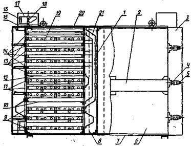 1 – поперечная перегородка; 2 – балка; 3 – дверца; 4 – кронштейн; 5 – гайка; 6 - боковая обшивка; 7 – днище; 8 – труба; 9 – сортировочные ситовые рамы; 10,12 - сборные рамы; 11 - подсевные ситовые рамы; 13 – приемно-подсевные рамы; 14 – приемные ситовые рамы; 15 – приемный патрубок; 16 – груз; 17 – конус; 18 – ось; 19 - резиновые шарики; 20 – крышка; 21- перепускной клапан.