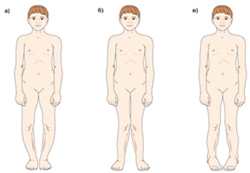 :Рис. 11. Нарушение осей нижних конечностей: а) О – образные ноги, б) Х – образные ноги, в) косолапость.
