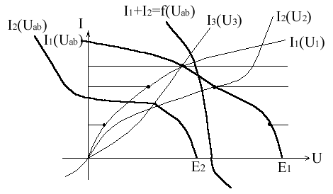 Используем правила последовательного соединения. Задаем различные значениятоков I1, находим Uнэ1, строим ВАХ I1(Vab) (I1 Þ Uнэ1Þ Uab = Е1 - Uнэ1) 2. Запишем выражения для I закона Кирхгофа I1 + I2 = I3 Þ I1 + I2 = f(Uab) Нужно 1 и 2 ветви заменить эквивалентной. 3. Строим ВАХ I1 + I2 = f(Uab). Используем правила построения параллельносоединенных ветвей. Задаем значение Uab, определяем I1 и I2 от Uab по ВАХ и используя II закон Кирхгофа строим ВАХ I1 + I2. 4. Определяем точку рабочего режима и напряжение Uab. Точка рабочего режима находится на пересечении ВАХ I1 + I2 = f и I3(Uab), т.к. здесь выполняется I закон Кирхгофа I1 + I2 = I3. 5. Определяем токи в параллельных ветвях.