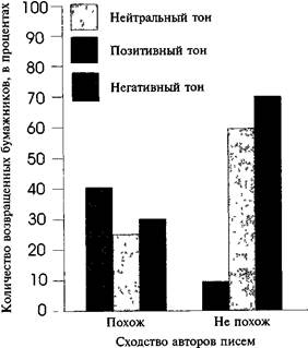 Роль сходства в социальном сравнении была продемонстрирована в занимательном эксперименте, опубликованном Харви Хорнстайном, Элишей Фиш и Майклом Холмсом в 1968 году. В этом опыте более 100 пешеходов в центре Манхэттена находили подписанный, но неоплаченный конверт, содержащий потерянный бумажник и письмо к владельцу. Среди прочих вещей в бумажнике были: мелочь на 2 доллара, чек Е.М.Н.Со. (аббревиатура была получена из первых букв имен исследователей!), обрывок бумажки с телефонным номером и идентификационная карточка с именем, телефоном и адресом владельца. Имя владельца было Майкл Эрвин — тщательно выбранное, чтобы (246:) избежать каких- либо национальных или религиозных ассоциаций, — и в каждом случае бумажник и его содержимое были одинаковыми. Разными были письма к владельцу. В некоторых вариантах письмо было написано кем- то, кто мог быть похож на субъекта- пешехода (т.е. человеком, говорящим по- английски, эдаким городским парнем), в других — кем- то, явно непохожим на субъекта (например, иностранцем, плохо знающим английский). Кроме того, в одной трети писем у автора был доброжелательный тон, в одной трети — нейтральный и в одной — негативный. Например, негативное письмо от англоязычного корреспондента звучало так: Дорогой мистер Эрвин: Я нашел ваш бумажник, который и возвращаю. Все в нем в таком виде, в каком я его нашел. Должен сказать, что хранить ваш бумажник и пересылать его вам мне было очень неудобно и причинило мне массу неудобств. Надеюсь, вы оцените мои усилия. С другой стороны, негативное письмо от непохожего на субъекта человека звучало так: Дорогой мистер Эрвин: При посещении вашей страны с чуждыми, незнакомыми мне обычаями я нашел ваш бумажник, который вам и возвращаю в целости и сохранности. Беспокойство за бумажник и необходимость его возвращения причинили мне массу неудобств. Надеюсь, вы оцените мои усилия Хорнстайн, Фиш и Холмс предположили, что люди окажутся под влиянием тона письма скорее, если писавший похож на них, чем если он от них отличается (т.е., они считали, что если автор письма похож на читающего, то доброжелательные письма скорее заставят вернуть бумажник, чем негативные. Если же автор не похож на читающего, тон не будет иметь значения). Как видно на рис. 17.3 это было точное предположение. Когда автором письма был горожанин, бумажники, сопровожденные позитивными письмами, возвращались в семь раз чаще, чем сопровожденные негативными письмами. И наоборот, возвращение бумажников с позитивными, нейтральными и негативными письмами, написанными не похожими на нашедших конверты людей, было почти одинаково интенсивным. Несмотря на то что сами по себе эти результаты не могут служить основанием