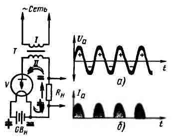 Рис. 3. Если в лампу накаливания ввести анод и удалить из балона воздух, она превратится в простейшую электронную лампу - диод. Наряду с термином «анодное напряжение» применяют также термины «напряжение на аноде», «напряжение анода». Все эти термины равнозначны: они подразумевают напряжение, действующее между анодом и катодом. Если полюсы анодной батареи или иного источника тока присоединены непосредственно к катоду или аноду лампы, то анодное напряжение будет равно напряжению источника тока. А теперь подумайте и ответьте: будет ли в анодной цепи диода протекать ток, если положительный полюс анодной батареи соединить с нитью накала, а отрицательный - с анодом? Конечно, нет. Ведь анод в этом случае имеет отрицательный заряд. Он будет отталкивать электроны, испускаемые катодом, и никакого тока в этой цепи не будет. Итак, двухэлектродная электронная лампа, как и полупроводниковый диод, обладает свойством односторонней проводимости тока. Но она в отличие от полуповодникового диода пропускает через себя только прямой ток, т.е. ток только в одном направлении - от катода к аноду. В обратном направлении, т.е. от анода к катоду, ток идти не может. В этом отношении радиолампа, бесспорно, превосходит полупроводниковый диод, через который течет небольшой обратный ток. Что влияет на значение анодного тока диода? Если катод имеет постоянный накал и излучает беспрерывно одно и то же количество электронов, то анодный ток зависит только от анодного напряжения. При небольшом анодном напряжении анода достигнут лишь те электроны, которые в момент вылета из катода обладают наиболее высокими скоростями. Другие, менее «быстрые» электроны останутся возле катода. Чем выше анодное напряжение, тем больше электронов притянет к себе анод, тем значительнее будет анодный ток. Однако не следует думать, что повышением анодного напряжения можно бесконечно увеличивать анодный ток. При некотором достаточно высоком анодном напряжении все электроны, излучаемые катодом, будут попадать на анод и при дальнейшем увеличении напряжения на аноде анодный ток перестает расти. Это явление называют насыщением анода. Увеличить эмиссию катода можно повышением напряжения накала. Но при этом продолжительность жизни лампы резко уменьшается, а при чрезмерно большом напряжении накала катод быстро теряет эмиссию или совсем разрушается. А что происходит в анодной цепи анода, когда в ней действует переменное напряжение? Обратимся к (рис. 4). Здесь, как и в предыдущем примере, катод диода накаляется током батареи GBH. На анод лампы подается перменное напряжение, источником которого служит вторичная (II) обмотка сетевого трансформатора Т. В этом случае напряжение на аноде периодически изменяется по значению и знаку (рис. 4, а).