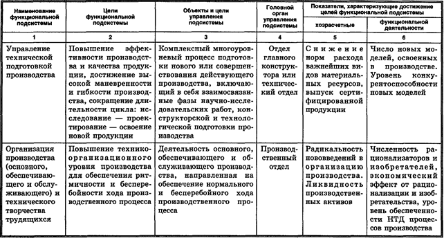Состав конкретных функций управления зависит главным образом от масштаба организации и степени диверсификации деятельности: чем больше масштаб организации и разнообразнее ее деятельность, тем уже специализация менеджеров и в большей степени дифференцируются конкретные функции. Так, из функции рационализации производства и технологии может быть выделена функция координации технических разработок; функция маркетинга может быть расчленена на функции: маркетинговые исследования, реклама, сбыт, послепродажное обслуживание; не исключено, что целесообразно выделить конкретную функцию связи с общественностью и т. д. На предприятиях малых масштабов нет необходимости в узкой специализации менеджеров и конкретные функции укрупняются. Специальная функция управления есть подфункция конкретной функции, ориентированная на достижение определенной цели деятельности, то есть на достижение установленных стратегической программой (планом) конечных результатов деятельности по соответствующей конкретной стратегии (направлению деятельности). Состав специальных функций, принадлежащих к той или иной конкретной функции, определяет ответственность конкретного органа управления за достижение тех или иных целей. Состав специальных функций, принадлежащих к различным конкретным функциям (органам управления), но ориентированных на одну и ту же цель, определяет зоны ответственности функциональных органов управления за достижение данной цели. Состав и характеристика функциональных подсистем. Как было указано выше, состав функционального управления определяется конкретными функциями управления. В системе управления компанией по каждой конкретной функции управления выделяется функциональная подсистема, содержащая специальные функции управления и соответствующий состав органов управления. Не следует отождествлять функциональную подсистему с каким-либо отделом (службой). Например, подсистема стратегического, текущего и оперативного планирования не тождественна планово-экономическому отделу, являющемуся лишь головным органом этой подсистемы. Эта подсистема включает в себя весь состав функций планирования деятельности объединения и предприятия как единого объекта управления. В состав подсистемы, кроме планово-экономического отдела, входит и ряд других подразделений управления, осуществляющих эту функцию. Поэтому основной документ (стандарт) такой подсистемы не может быть тождествен положению о планово-экономическом отделе. Таким образом, в каждой функциональной подсистеме интегрируется деятельность нескольких функциональных органов по выполнению той или иной конкретной функции управления. Каждая подсистема имеет свой объект управления и свои цели. Характеристика некоторых функциональных подсистем системы управления компанией среднего масштаба дана в табл. 5.6. Таблица 5.6. Характеристика функциональных подсистем системы управления компанией (фрагмент)