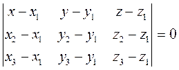 Expressing the triple product in terns of coordinates, we obtain an equation of the plane, passing through the three given points: