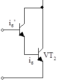 Если не удается подобрать транзистор с соответствующими предельными характеристиками, то применяют параллельное соединение однотипных элементов (рис. 5.53). Поскольку зависимость предельных значений Ik=f (Uk) нелинейна, уменьшение тока через каждый транзистор в два раза (при соединении 2-х транзисторов), то допустимое напряжение Uk возрастает значительно резче. Для выравнивания токов через транзисторы в эмиттерные цепи включаются выравнивающие резисторы, сопротивление которых должно быть в несколько раз больше дифференциального сопротивления эмиттерного перехода (gэ) при максимальном токе коллектора. Резисторы Rэ являются элементами обратной связи и их включение приводит к снижению усилительных свойств транзисторов. Особенностью мощных транзисторов являются сравнительно низкие значения коэффициентов передачи по току, что обусловливает потребление значительной мощности от источника управляющего сигнала (или от каскада предварительного усиления). Для снижения мощности управления применяется схема составного транзистора (схема Дарлингтона) (рис. 5.54), в котором ток управления уменьшен пропорционально усилению по току базы дополнительного транзистора VT1, который может быть значительно менее мощным, чем основной. В настоящее время основное применение в усилителях мощности находят МДП-транзисторы, обладающие меньшими потерями и большей температурной устойчивостью.