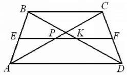 Приклад 4. Основи трапеції 5 дм і 40 см. Знайти довжину відрізка, що з'єднує середини діагоналей. Л Нехай АВСБ - трапеція, точка Р - середина діагоналі АС, точка К - середина діагоналі ВО. Точки Р й К розташовані на середній лінії ЕР трапеції. З того, що ЕК - середня лінія трикутника АВО, а середня лінія трикутника - це відрізок, що з'єднує середини двох сторін трикутника, паралельний третій стороні і дорівнює іі половині, випливає, що EK = — см = 25 см. Аналогічно, EP = — см = 20 см, оскі- льки ЕР є середньою лінією А ABC. Отже, PK = EK - EP = 25 - 20 = 5 см. Відповідь: 5 см. ► 1.4. Індивідуальне завдання № 1.2 Студент повинен розв'язати одну з наведених нижче задач, вибравши її за своїм номером у журналі групи. Знайти: 1. Синус кута B трикутника ABC, якщо AC = 4 см, BC = 5 см, cos A = —; 2. Довжину сторони ромба, якщо довжини діагоналей ромба відносяться як 1:2, а площа ромба дорівнює 12 см; 3. Площу кільця, якщо у коло вписаний правильний трикутник, площа якого дорівнює 9л/з см2, і в трикутник вписане коло; 4. Площу трикутника ABD, якщо в трикутнику ABC кут при вершині C дорівнює 1350, AC = 6 см, висота BD = 2 см; 5. Синус кута A трикутника ABC, якщо AC = 4см, BC = 7см, AB = 5см; З 6. Довжину сторони AB трикутника ABC, якщо BC = 9 см, cos C = —, =2 sin A = —; 7. Відстань від центра кола до хорди, яка стягає дугу в 600, якщо радіус кола Зл/27 см; 8. Довжину першої діагоналі, якщо друга діагональ паралелограма, довжиною 4л/6 см, утворює з основою кут 600, а перша діагональ утворює з тією ж основою кут 45; 9. Відстань від центра кола до хорди, якщо в колі, площа якого дорівнює 6,25псм, проведена хорда довжиною 3 см; 10. Суму довжин катетів прямокутного трикутника, якщо в трикутнику довжина гіпотенузи дорівнює 20 см, а радіус вписаного кола - 4 см; 11. Довжину сторони ромба, якщо площа ромба дорівнює 18 см, а гострий кут 300;