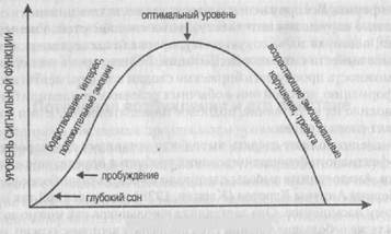 В понятие «активация» включаются как предварительные условия ее возникновения, так и вызываемые ею феномены. В общих чертах можно охарактеризовать здесь лишь некоторые из них. Из зависимых от активации переменных исследовались прежде всего переменные, связанные с достижением. Если говорить упрощенно, то результатом исследований было установление зависимости в форме перевернутой U-образной кривой. При низкой и очень высокой активации уровень достижений.снижается, а средний ее уровень является наиболее благоприятным. Конечно, при этом важную роль играет и степень трудности (сложности) задачи: чем она выше, тем, по-видимому, эффективнее будет более низкий уровень активации. Эта зависимость получила широкую известность под названием правила Йеркса—Додсона. Эти авторы еще в 1908 г. обнаружили, что для научения животным прохождения лабиринта наиболее благоприятна средняя интенсивность мотивации (она задавалась интенсивностью удара тока). При этом для легких лабиринтов оптимальный показатель интенсивности мотивации оказался выше, чем для трудных. Хебб (Hebb, 1955) истолковывал эту перевернутую U-образную кривую как результат взаимодействия функции активации и сигнальной функции. Раздражители, действующие на органы чувств, не только перерабатываются в качестве несущих определенную информацию сигналов, но и вносят неспецифический вклад в общий уровень активации. Чтобы сигнальная функция достигла оптимального уровня, требуется определенная степень активации соответствующих участков мозга. На рис. 4.17 схематично представлена позиция Хебба.