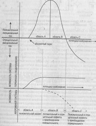Рис. 4.20. Кривая Вундта {вверху} и две ее гипотетические составляющие (внизу), описывающие активность системы первичного подкрепления и аверсивной системы как функцию потенциала возбуждения (Berlyne, 1973, р. 19) На этих и подобных данных построена психология эстетики Берлайна (Berlyne, 1971, 1974). Произведение искусства может оказывать приятное впечатление на реципиента,поскольку оно сдвигает уровень его активации к оптимуму. Произведение искусства может, однако, оказаться непривлекательным или даже отталкивающим, если оно воспринимается реципиентом как слишком оригинальное и сложное. Эта негативная реакция может смениться позитивной,если реципиент будет постепенно знакомиться с произведением, например несколько раз прослушает музыкальную пьесу. Если же произведение становится настолько знакомым, что уже не содержит ничего нового и неожиданного, то оно теряет свою активирующую функцию,оставляя реципиента равнодушным. В отличие от Берлайна Хебб (Hebb, 1955), а также Фиске и Мадди (Fiske, Maddi,1961) определяли средний уровень активации и соответственно (а для них это то же самое) средний потенциал возбуждения как оптимальное состояние, к которому стремится организм. Все изменения, приводящие к среднему уровню, оказывают подкрепляющее воздействие. Чтобы сделать совсем ясным различие между постулатами Хебба и Берлайна, на рис. 4.21 сопоставлены гипостазированные обоими авторами отношения между потенциалом возбуждения (поступающей стимуляцией) и активацией, с одной стороны, и между активацией и привлекательностью (предпочтительное состояние активации), с другой. Различия связан],] прежде всего с областью низкого потенциала возбуждения. Хотя эти постулаты всего лишь спекулятивные обобщения, многочисленные данные говорят, скорее, в пользу представлений Берлайна, который затратил много усилий, чтобы собрать свидетельства правильности своих взглядов. В заключение следует отметить, что приведенные положения теории активации очень близки так называемым мотпвацпопным теориям рассогласования. Как уже отмечалось в главе 2, на представлениях о рассогласовании строил свою теорию мотивации Мак-Клелланд (McClelland etal., 1953). Небольшие отклонения от нормы, нормального состояния сопровождаются положительным эмоциональным тоном и обладают мотивирующим характером независимо от того, оказываются ли они выше или ниже нормы.-Такие нормы называются уровнями адаптации (Helson,1964, 1973) и представляют собой нулевые точки в системе координат, лежащих в основе любых воспринимаемых впечатлений и любых оценочных процессов. Уровень адаптации постоянно смещается соответственно центральной тенденции актуального потока стимуляции и накопленного опыта.