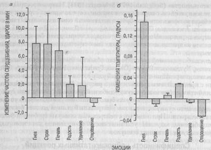 Рис. 4.23. Изменения частоты пульса и температуры пальцев при воспроизведении выражения лица, характерного для шести базовых эмоций На рис. 4.23 представлены результаты, полученные для двух нейровегетатив-ных показателей - изменения частоты сердцебиения И температуры пальцев — в случае внешнего воспроизведения выражения лица. При появлении трех из шести базовых эмоций наблюдается увеличение частоты пульса, однако лишь одна из этих эмоций, а именно гнев, приводит к одновременному повышению температуры пальцев. Аналогичным образом эмоции дифференцируются и при их повторном переживании. Примечательно, что одного лишь внешнего воспроизведения характерного для эмоции выражения лица посредством произвольного сокращения мышц оказалось достаточно, чтобы вызвать специфическую для данной эмоции реакцию автономной нервной системы. Отсюда можно сделать вывод, что либо афферентная обратная связь от лицевой мускулатуры, либо прямые связи между моторной корой и гипоталамусом являются связующим звеном между этими двумя областями проявления эмоциональной системы. Это относится к случаю внешнего воспроизведения специфического для каждой эмоции выражения лица. В случае же повторного переживания эмоции добавляется еще и третья область проявления эмоциональной системы — область переживаемых чувств. Остается неясным, как эти три области взаимосвязаны друг с другом, однако нет никаких сомнений в том, что они взаимосвязаны. Следует также подчеркнуть значение для эмоции выражения лица, как это уже сделали Дарвин и Томкинс. Двухфакторная теория эмоций Шахтера Роль, которую, по мнению Джеймса 0ames- 1884), играет восприятие нейровеге-татнвных реакций в возникновении переживаемых чувств, была поколеблена на основании многочисленных наблюдений и результатов исследований Кэннона (Cannon, 1927). Приведем некоторые из аргументов Кэннона: 1) после того, как афферентные сенсорные нервные пути подопытных животных перерезались, животные все же могли демонстрировать эмоциональные реакции гнева, страха или радости, обращенные к представителям своего вида; 2) отдельные нейровегетатив-ные реакции — начиная от частоты пульса и изменения величины зрачка и кончая выделениями желез желудочно-кишечного тракта — оказываются слишком однородными при самых различных вызывающих эмоциональную реакцию событиях, так что они не могут быть различительными признаками эмоций; 3) нейровегета-тивные процессы организма воспринимаются слишком плохо для того, чтобы давать возможность распознавать различные эмоциональные состояния; 4) многие нейровегетативные реакции являются чересчур медленными (их длительность составляет от нескольких секунд до нескольких минут) для того, чтобы давать возможность объяснить быстрые эмоциональные реакции, например, на предъявляемые картинки; 5) искусственно вызываемый (например, с помощью инъекции адреналина) нейровегстативный комплекс реакций, характерных для определенной эмоции, приводит не к соответствующему эмоциональному переживанию, а, скорее, к восприятию телесных симптомов типа дрожи, озноба, сухости во рту, раздражительности и т. д. Что касается последнего пункта, то Маранон (Maranon, 1924) обнаружил, что после введения адреналина 29 % его пациентов сообщали наряду с телесными симптомами и об эмоциях в форме «как будто». Насто