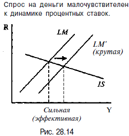 В этом случае эффект вытеснения очень мал, так как и повышение ставок процента очень незначительно, и коэффициенты d и n очень малы. Общий прирост Y составляет величину. Стимулирующая фискальная политика относительно неэффективна, если эффект вытеснения превосходит эффект прироста выпуска. Эффект вытеснения значителен, если: 1) инвестиции и чистый экспорт высокочувствительны к динамике процентных ставок, то есть коэффициенты d и n очень велики. В этом случае даже незначительное увеличение R вызовет большое снижение I и Хn и поэтому общий прирост Y будет мал. (рис. 28.10). 2) Спрос на деньги малочувствителен к динамике R. В этом случае для того, чтобы уравновесить денежный рынок, нужно очень значительное повышение R. (рис. 28.11).. Стимулирующая фискальная политика оказывается наименее эффективной в случае сочетания относительно пологой IS и крутой LM. В этом случае прирост Y, равный (Y0Y1), очень мал, так как и повышение ставок процента очень велико, и коэффициенты d и n значительны (рис. 28.12).