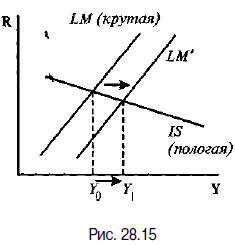 2. Если спрос на деньги малочувствителен к динамике R. Графически это соответствует относительно крутой LM (рис. 28.14). В этом случае прирост денежной массы сопровождается очень большим снижением процентных ставок, что сильно увеличивает I и Xn даже при относительно незначительных коэффициентах d и n. Угол наклона IS в данном случае имеет второстепенное значение. Стимулирующая денежно-кредитная политика наиболее эффективна при сочетании относительно крутой LM и пологой IS (рис. 28.15). В этом случае и снижение процентных ставок весьма существенно и коэффициенты d и n значительны. Поэтому прирост Y, равный (Y0Y1), относительно велик.