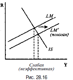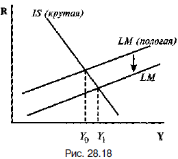 Относительная эффективность стимулирующей монетарной политики определяется величиной стимулирующего эффекта от увеличения денежной массы и снижения процентных ставок на динамику инвестиций и чистого экспорта. Этот стимулирующий эффект противоположен эффекту вытеснения. Стимулирующий эффект на I и Хn относительно велик в 2 случаях: 1. Если I и Хn высокочувствительны к динамике процентных ставок. Графически это соответствует относительно пологой IS (рис. 28.13). В этом случае даже незначительное снижение R в ответ на рост денежной массы приводит к значительному росту I и Хn, что существенно увеличивает Y. Угол наклона кривой LM в данном случае имеет второстепенное значение.