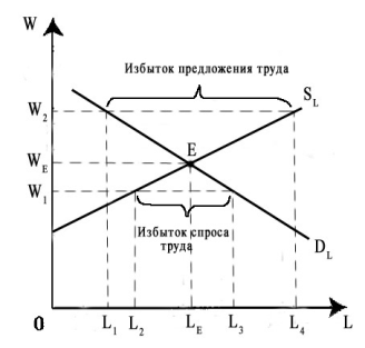 Отрицательные 1. Сокращение производства. 2. Утрата квалификации. 3. Снижение жизненного уровня. 4. Недопроизводство национального дохода. Положительные 1. Создание резерва рабочей силы для структурной перестройки экономики. 2. Конкуренция между работниками как стимул к развитию способностей к труду. 3. Перерыв в занятости для переобучения и повышения уровня образования. 4. Стимулирование роста интенсивности и производительности труда. Равновесие на рынке труда — это ситуация на рынке труда, когда определенному уровню ставки заработной платы соответствует предложение труда, заданное этим уровнем. На графике по вертикальной оси откладывается уровень ставки заработной платы (W), а по горизонтальной — количество предложения труда (L). Как на товарном, так и на рынке труда присутствуют спрос (DL) и предложение труда (SL). Точка пересечения кривых спроса и предложения труда (точка E) соответствует уровню ставки заработной платы WE и количеству предложения труда LE. В данной точке спрос на труд равен предложению труда. Именно в точке E наступает равновесие на рынке труда и достигается полная занятость.