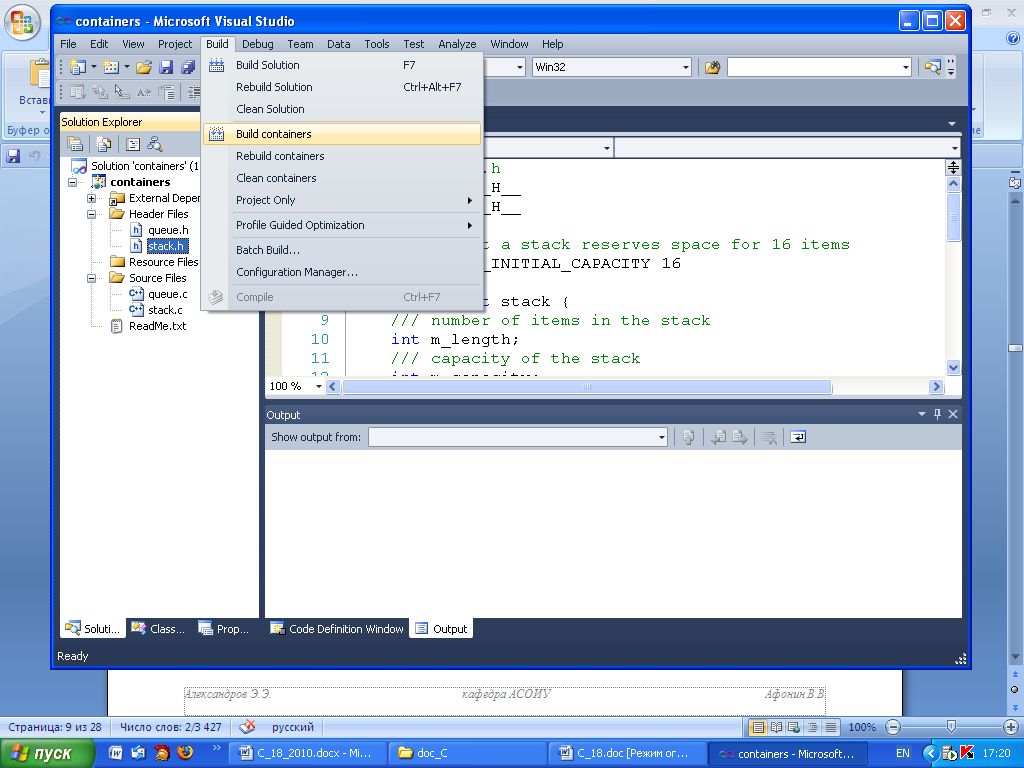 Добавление файлов в проект библиотеки производится стандартным образом, как и для проекта Win32 Console Application. В соответствии с рис. 20.3 существующие файлы, которые будут использоваться в многофайловом проекте, могут быть подключены при установке курсора мыши на папках Header Files, Resource Files, Source Files с последующим нажатием правой клавиши и выбором пункта меню Add, а именно Existing Item. Для подключения h -файлов(*.h) следует обратиться к папке проекта Header Files, для с -файлов, (*.с,) использовать папку Source Files. Выполним подключение существующих файлов stack.h / stack.c, queue.h / queue.c, реализующих в простейшем виде две важные структуры данных – стек и очередь. Статическая библиотека является не исполняемой программой, а только механизмом для хранения подпрограмм, поэтому среди ее функций не должно быть функции main(). После подключения файлов получится форма с открытой программой файла stack.h (рис. 20.4).