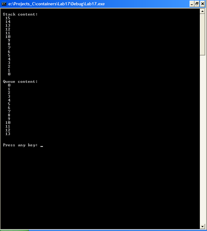 В процессе сборки библиотеки компилятор и библиотекарь (Librarian) выводят в окно сообщений (Output) среды Visual Studio диагностическую информацию, содержащую результаты компиляции каждого из модулей, подключенных к проекту статической библиотеки, возможные предупреждения компилятора и конечную статистику (например, количество ошибок и предупреждений) сборки библиотеки (рис. 20.12). В результате произведенной компиляции получаем папку с именем созданной библиотеки (containers), где в папке Debug располагается двоичный объектный библиотечный модуль – файл с расширением .lib. Для данного случая это файл containers.lib.