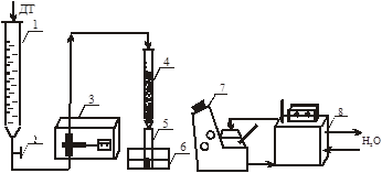 Рис.1.Установка адсорбционной очистки остатка газового конденсата. 1-расходная емкость, 2-зажим, 3-поршневой насос, 4-адсорбционная колонка, 5-приемник-пробирка, 6-подставка, 7-рефрактометр, 8-термостат.