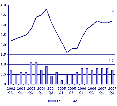 GDP rose by 0.7 per cent in the third quarter of 2007, down from 0.8 per cent in the second quarter and revised down by 0.1 per cent compared with the preliminary estimate. The level of GDP is now 3.2 per cent higher than the third quarter of 2006. The output of the production industries was flat in the latest quarter compared with a rise of 0.7 per cent in the previous quarter. The decrease in growth was due to weakness in mining and quarrying, down 1.3 per cent and flat growth in manufacturing. Growth in the service industries rose by 0.9 per cent in the third quarter, the same rate recorded in the previous quarter. Growth continues to be dominated by the business and financial services sector, however growth slowed a little to 1.5 per cent following growth of 1.7 per cent in the previous quarter.