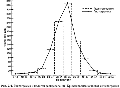 Ориентированные и неориентированные графы часто применяются при описании результатов личностных и социально-психологических исследований, в частности социометрических: социограмма — это ориентированный граф. Любая граф-схема изоморфна матрице (предположений, корреляций и т.д.). Для удобства восприятия не рекомендуется использовать при описании результатов графы более чем с 10-11 вершинами. Наряду с графами в психологии применяются и пространственно-графические описания, в которых учитывается структура параметров и отношения между элементами (либо метрические, либо топологические). Примером является известное описание структуры интеллекта — «куб» Д. Гилфорда. Другой вариант применения пространственного описания — пространство эмоциональных состояний по В. Вундту или же описание типов личности по Г. Айзенку («круг Айзенка»). В случае если в пространстве признаков определена метрика, то используется более строгое представление данных. Положение точки в пространстве, изображенном на рисунке, соответствует реальным координатам ее в пространстве признаков. Таким способом представляются результаты многомерного шкалирования, факторного анализа, латентно-структурного анализа и некоторых вариантов кластерного анализа. Каждый фактор отображается осью пространства, а параметр проведения, измеренный нами, — точкой в этом пространстве. В других случаях, в частности при описании результатов дифференциально-психологических исследований, точками изображаются испытуемые, осями — главные факторы (или латентные свойства). Для первичного представления данных используются другие графические формы: диаграммы, гистограммы и полигоны распределения, а также различные графики. Первичным способом представления данных является изображение распределения. Для отображения распределения значений измеряемой переменной на выборке используют гистограммы и полигоны распределения. Часто для наглядности распределение показателя в экспериментальной и контрольной группах изображают на одном рисунке. Гистограмма — это «столбчатая» диаграмма частотного распределения признака на выборке. Используется декартова система координат. При построении гистограмм на оси абсцисс откладывают значения измеряемой величины, а на оси ординат — частоты или относительные частоты встречаемости данного диапазона величины в выборке. Если на гистограмме отображены относительные частоты, то площадь всех столбиков равна 1. В полигоне распределения количество испытуемых, имеющих данную величину признака (или попавших в определенный интервал величины), обозначают точкой с координатами: Х— градация признака, Y— частота (количество людей) конкретной градации или относительная частота (отнесение количества людей с этой градацией признака ко всей выборке). Точки соединяются отрезками прямой. Перед тем как строить полигон распределения, или гистограмму, исследователь должен разбить диапазон измеряемой величины, если признак дан в шкале интервалов или отношений, на равные отрезки. Рекомендуют использовать не менее 5, но не более 10 градаций. В случае использования номинальной или порядковой шкалы такой проблемы не возникает. Если исследователь хочет нагляднее представить соотношение между различными величинами, например доли испытуемых с разными 
