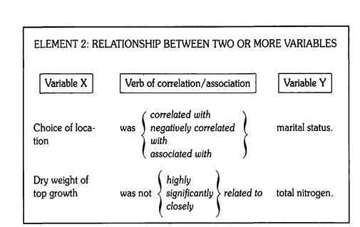 3. Findings of a third type show the relationship of one variable with another, or relationships among variables. When you report these kinds of results, it is common to use verbs of correlation or association in Element 2.