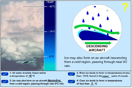 The pilot should check whether the following anti-icing and de-icing systems are on: · Pitot heating · Stall warner heating · Carburettor heating · Propeller heating / de-icing · Wing anti-ice / de-ice · Alternate air supply · Windshield heating They may also try a descent with higher power setting to increase bleed air supply. A higher approach/landing speed could compensate for a possible increase of weight. Partial or no flap settings on approach and landing could be tried to combat a possible increase of stalling speed.