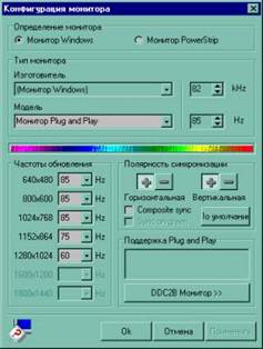 Этот пункт меню позволяет нам очень тонко настроить свой монитор. Для этого нужно сперва определиться, чью базу данных вы предпочтёте использовать – стандартную Windows или базу PowerStrip. Для этого необходимо указать фирму-изготовитель и модель монитора, после чего вы можете настроить частоты его регенерации для всех поддерживаемых монитором режимов. Кроме того, возможна точная ручная регулировка горизонтальной и вертикальной полярности синхронизации. Хочу обратить внимание, что если вы плохо себе представляете, что есть такое «полярность синхронизации», то лучше не изменяйте эти параметры.