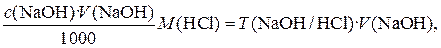 Чтобы найти связь между разными способами выражения концентраций, приравниваем массу определяемого вещества, рассчитанную при использовании разных способов. Пусть, например, известна молярная концентрация эквивалента NaOH, требуется рассчитать T(NaOH/HCl). Приравниваем правые части уравнения (6) и (9):