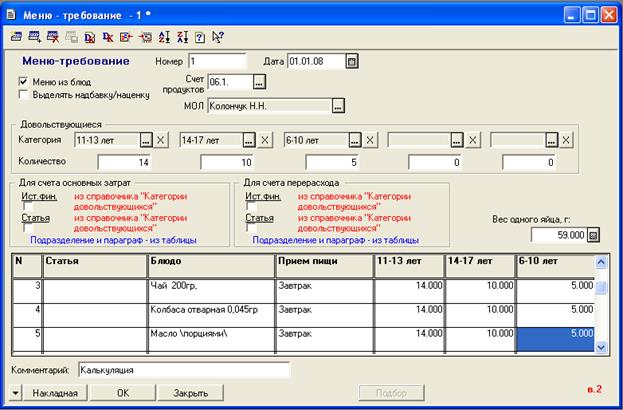 Рис.29.2 Документ «Меню-требование». Режим «Меню из блюд».