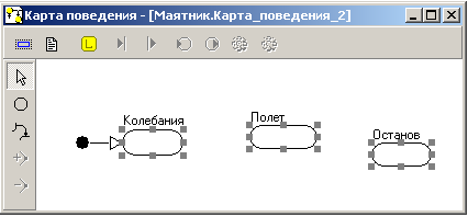 Руководствуясь этими правилами, создадим в классе «Маятник» новую карту поведения «Карта_поведения_1», кликнув дважды мышью на ее названии, перейдем в окно редактора карт поведения, введем в ней три новых узла и заменим их имена на «Колебания», «Свободный_полет» и «Останов» (Рис 6.11Рис 6.7).